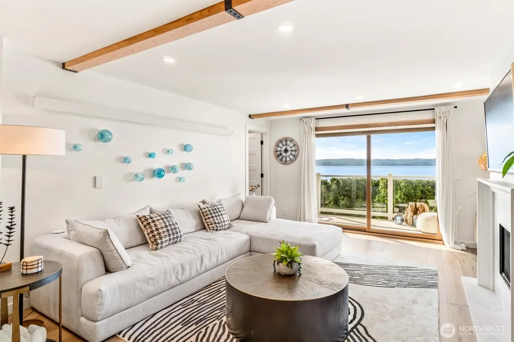 Breathtaking Sound & Mountain Views from this completely remodeled waterfront condo unit at West Beach! Remodeled to perfection with a well-designed, open floor plan concept which maximizes views throughout. Amazing kitchen with quartz counters, stainless steel appliances, custom cabinets, automated blinds & high tech designer wall heat. The primary suite has commanding water & mountain views as well as a Spa Like 5 piece bath. Engineered white oak floors throughout, gas fireplace, storage unit, in unit washer/dryer, designated covered parking spot & large spacious deck for relaxing & enjoying your view. Well managed & maintained complex with so many amenities, such as pool, sauna, community room, workshop & a launch for your kayak. Serene, secluded setting & prime location! A must See!