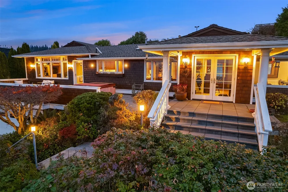 Panoramic Puget Sound & Olympic views from this West-facing rambler in coveted Innis Arden. Incredible outdoor entertaining w/ views & fun from the private athletic court. Gazebo & front west-facing deck w/ hot tub to soak in sunsets. Spacious entry flows into formal living w/ gas fireplace & expansive windows framing water & mountain vistas. Formal dining w/ built-in buffet & cabinetry for effortless entertaining. Chef-style country kitchen w/ Viking gas range & granite counters. Family room has custom media cabinetry, wood stove, & wet bar for ultimate relaxation. Primary Bed offers French doors leading to the back deck & athletic court. Hardwoods run throughout + hardwoods beneath carpeting. 2-car garage w/ abundant storage & workbench.